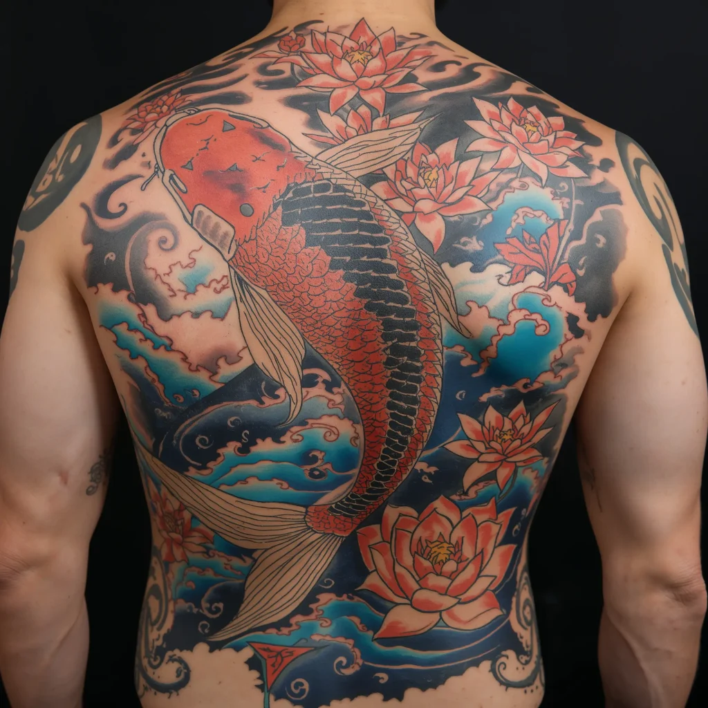 The water elements surrounding koi add incredible dynamic energy. Waves crash, lotus flowers bloom, and cherry blossoms fall – each element adds layers to your story. When done right, your entire back becomes this living Japanese watercolor painting.