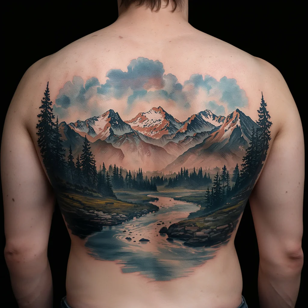Landscape tattoos turn your back into a canvas for entire ecosystems. Mountains rise from your lower back, forests spread across your middle, and clouds drift near your shoulders. It’s like carrying your favorite hiking spot everywhere you go.