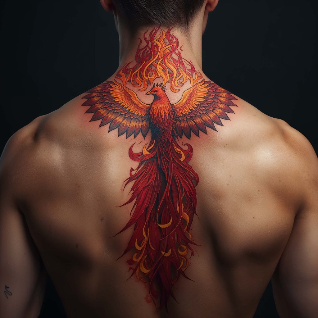 Phoenix tattoos hit different when they’re climbing up your spine. The vertical placement naturally supports the rising motion, making the resurrection symbolism even more powerful. Every time you stand tall, your phoenix rises with you.