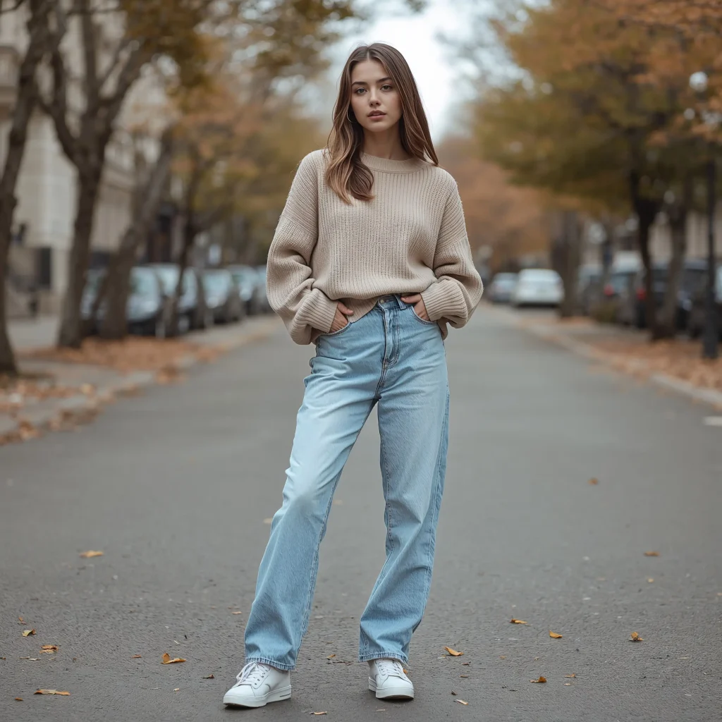 This combo literally screams effortless elegance, and I wear it at least twice a week. You know that perfect oversized sweater that makes you feel like you’re wrapped in a cloud? Pair it with your baggiest jeans, and boom – instant chic.