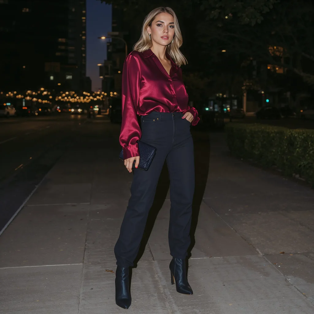 The key here is choosing a blouse with beautiful draping. Satin catches the light beautifully, making even the most casual jeans look elevated. Tuck it in completely for a polished look, or do a half-tuck for something more relaxed.
