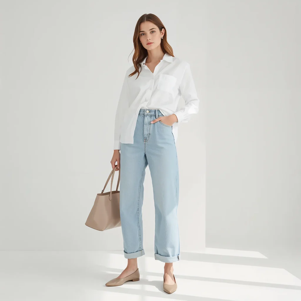 This pairing works because it’s clean, simple, and impossibly chic. The white shirt adds structure while the baggy jeans keep things relaxed. It’s basically the fashion equivalent of having your life together.