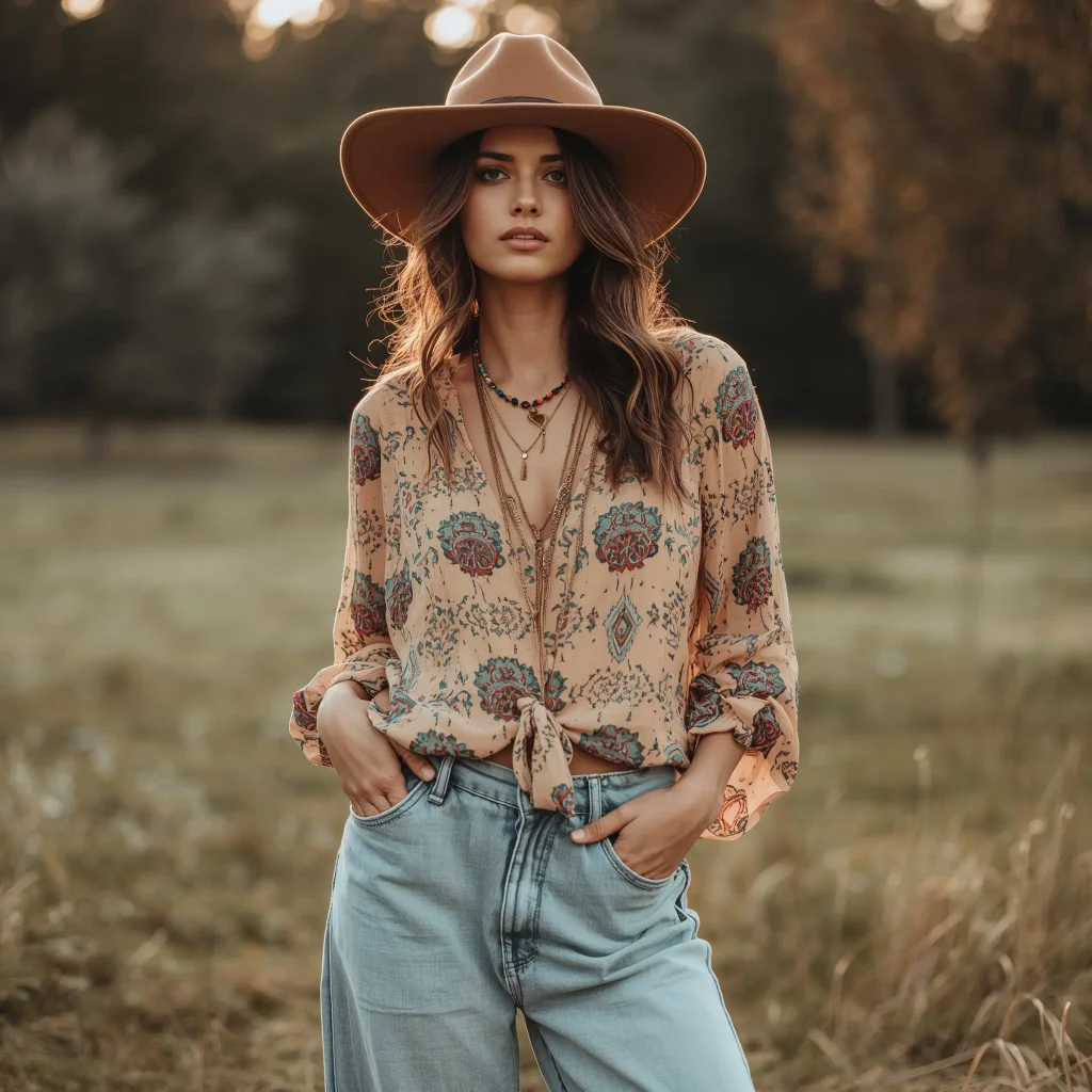 Channel your inner free spirit with this bohemian-inspired combination. The contrast between structured denim and a flowing top creates visual interest that’s both comfortable and stylish.