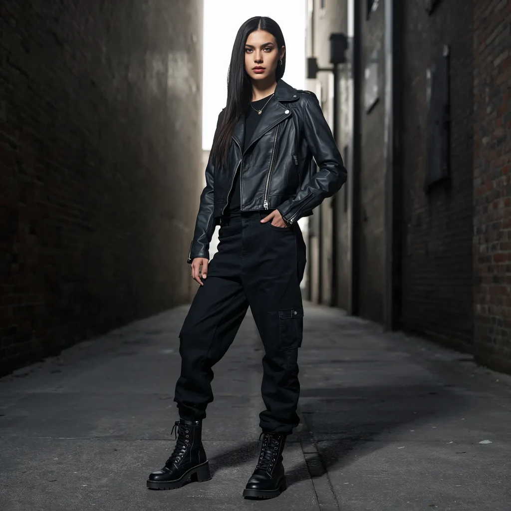 Want to look like you could be in a band? This combination is your answer. The leather jacket adds instant edge to the relaxed vibe of baggy jeans, creating a perfect balance of tough and casual.