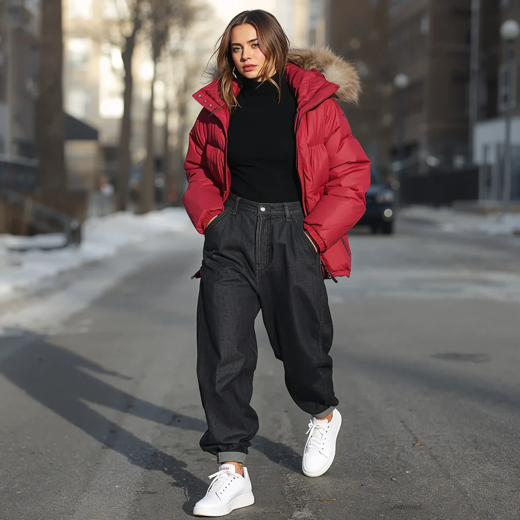 This outfit screams “I know what I’m doing” in the best way possible. Start with a fitted turtleneck as your base layer – this creates a sleek foundation that plays beautifully against the volume of your baggy jeans. Then throw on that puffer jacket, and boom, you’re winter-ready.