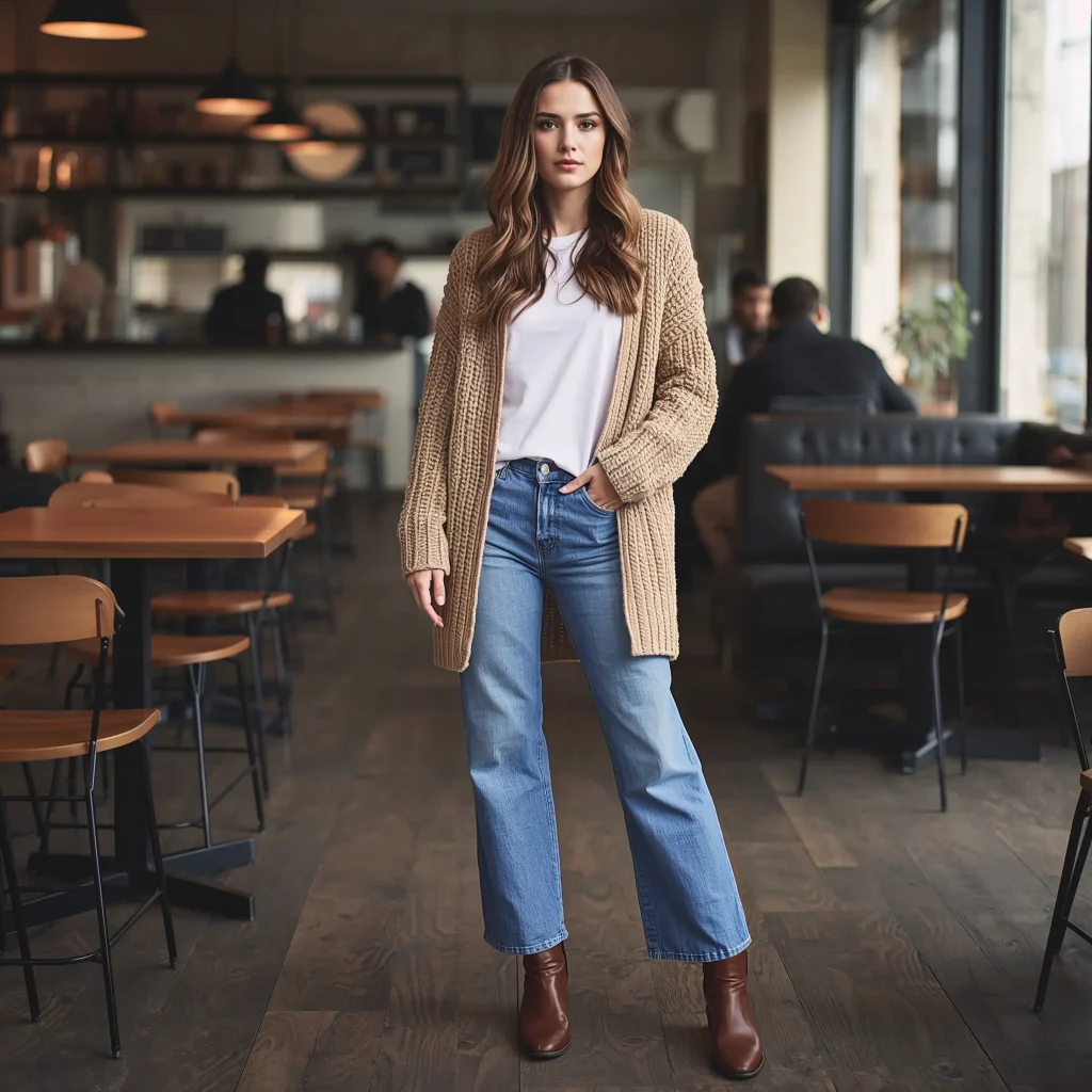 Ever wanted to look like you just stepped out of a cozy cabin but still maintain that urban edge? This outfit’s your answer. Chunky knit cardigans are having their moment, and paired with wide-leg baggy jeans, they create this perfect “I’m sophisticated but approachable” energy.