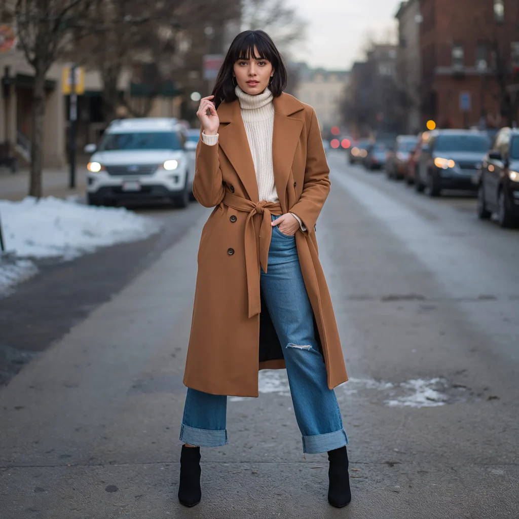 Choose a wool or cashmere blend coat that hits anywhere from mid-thigh to knee length. The belt doesn’t have to be anything fancy – even using the coat’s own belt works perfectly. Just cinch it at your natural waist and watch the outfit transform.