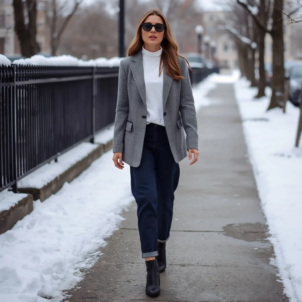 The contrast between the tailored blazer and relaxed jeans creates this perfect tension that fashion people love. Pick a blazer that’s slightly oversized but still structured – you want it to look intentional, not borrowed.