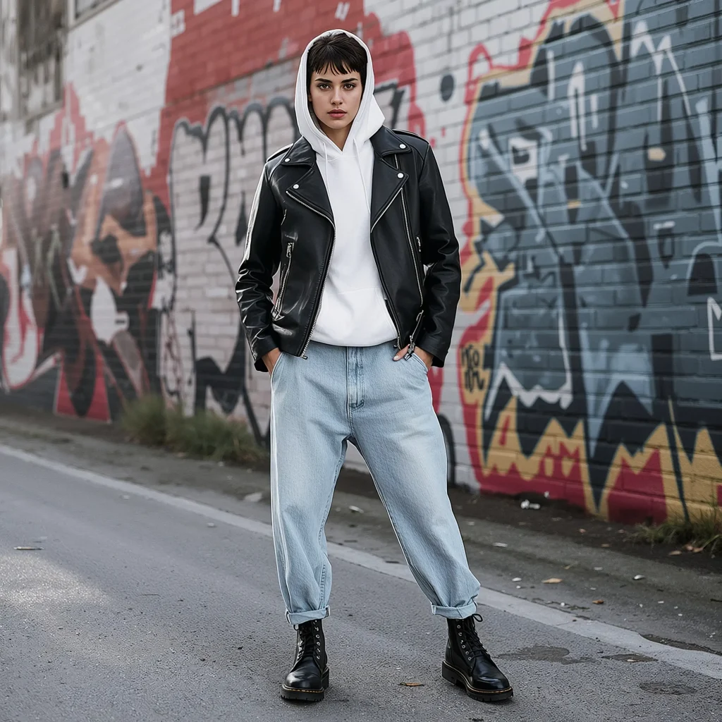 I’ve been rocking this look since forever, and here’s what I’ve learned: fit matters more than you think. Your leather jacket should hit right at your hip bone when wearing high-waisted baggy jeans. Any longer and you lose that perfect proportion.