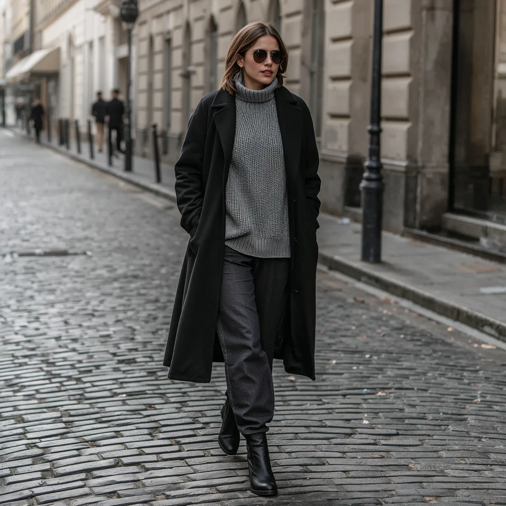 The trick is keeping everything underneath relatively fitted. Think slim-fitting thermal or a tucked-in shirt. This creates clean lines that complement the structured coat silhouette.