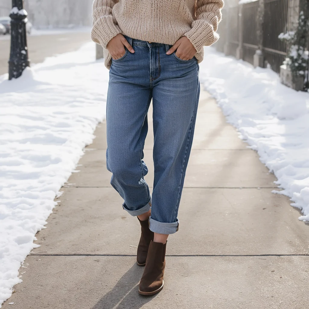 The cuffed baggy jeans and boots combo is basically winter uniform status at this point. Rolling or cuffing your jeans creates a deliberate, styled look that shows off your footwear choice. Plus, it prevents that awkward bunching at the ankle.