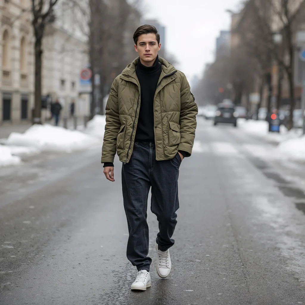 - Earth tones: Beige turtleneck, olive puffer, dark wash jeans