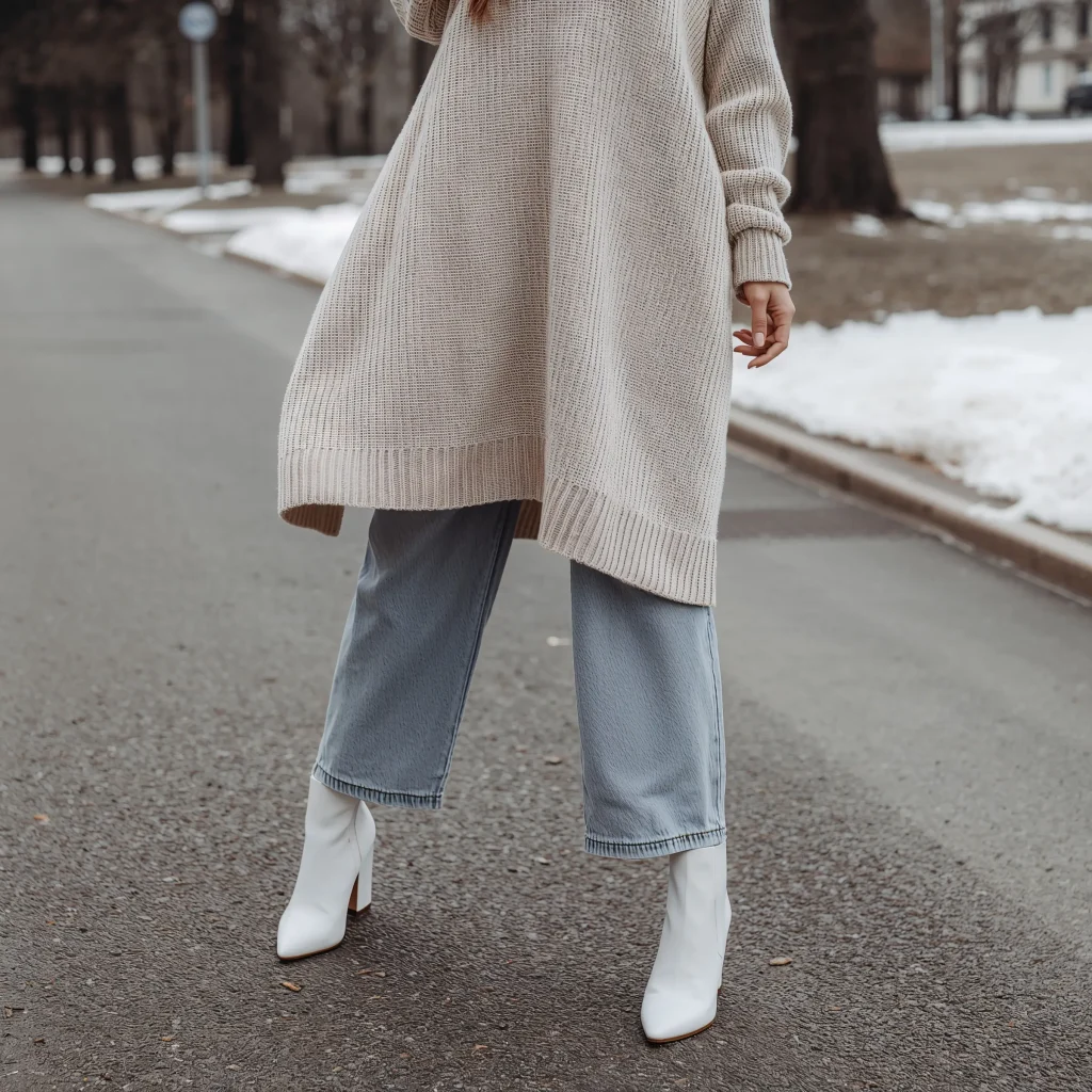 The key is choosing the right sweater dress. You want something that’s more tunic-length than mini – think hitting mid-thigh or just above the knee. Any shorter and it looks like you forgot pants; any longer and the proportions get weird.
