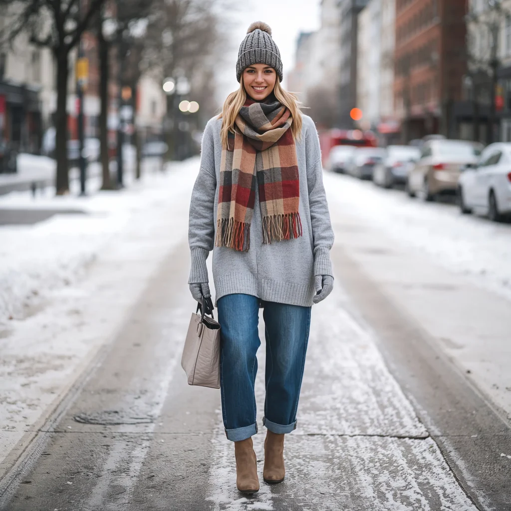 Sometimes the simplest combinations hit the hardest. A classic plaid scarf with neutral baggy jeans creates that effortlessly put-together look we’re all chasing. It’s basically the winter equivalent of “I woke up like this” – except you actually did put thought into it.