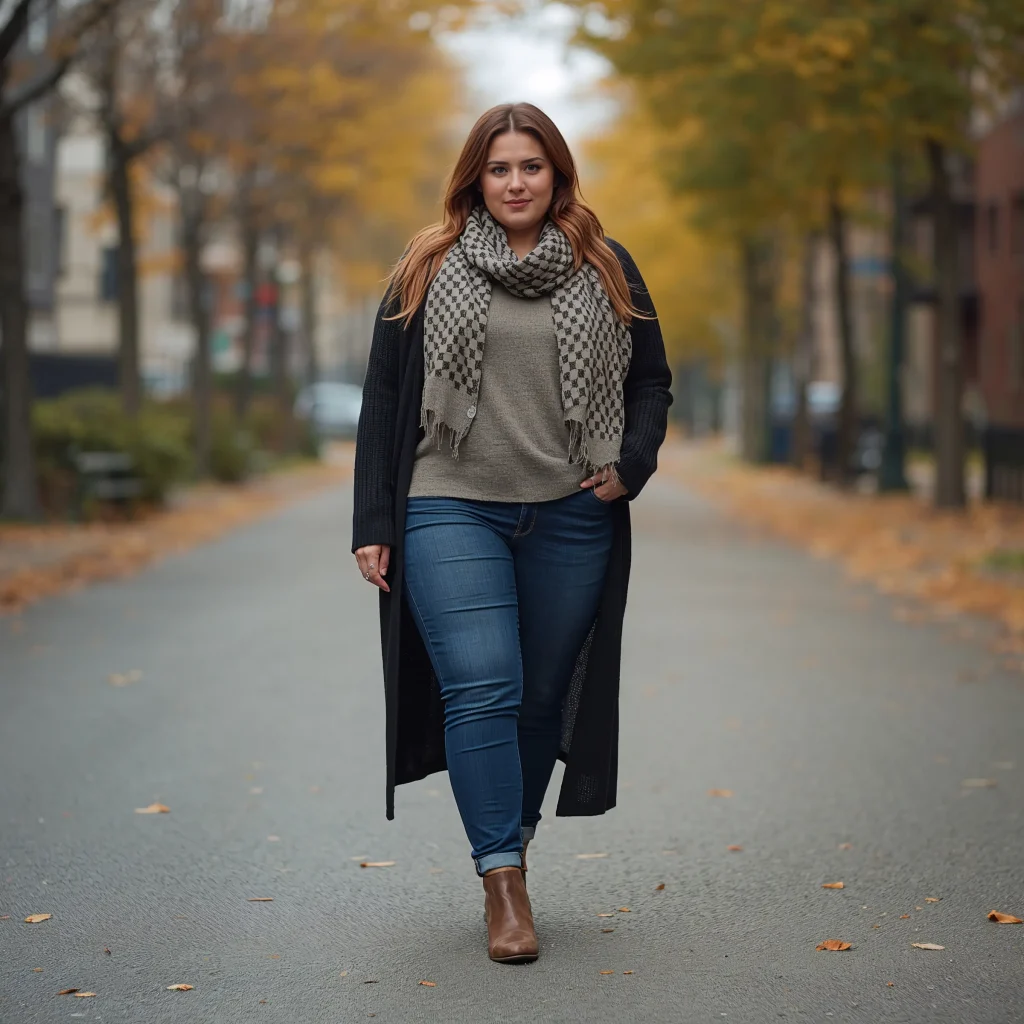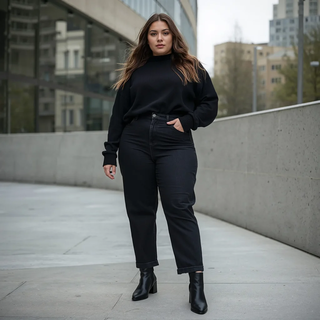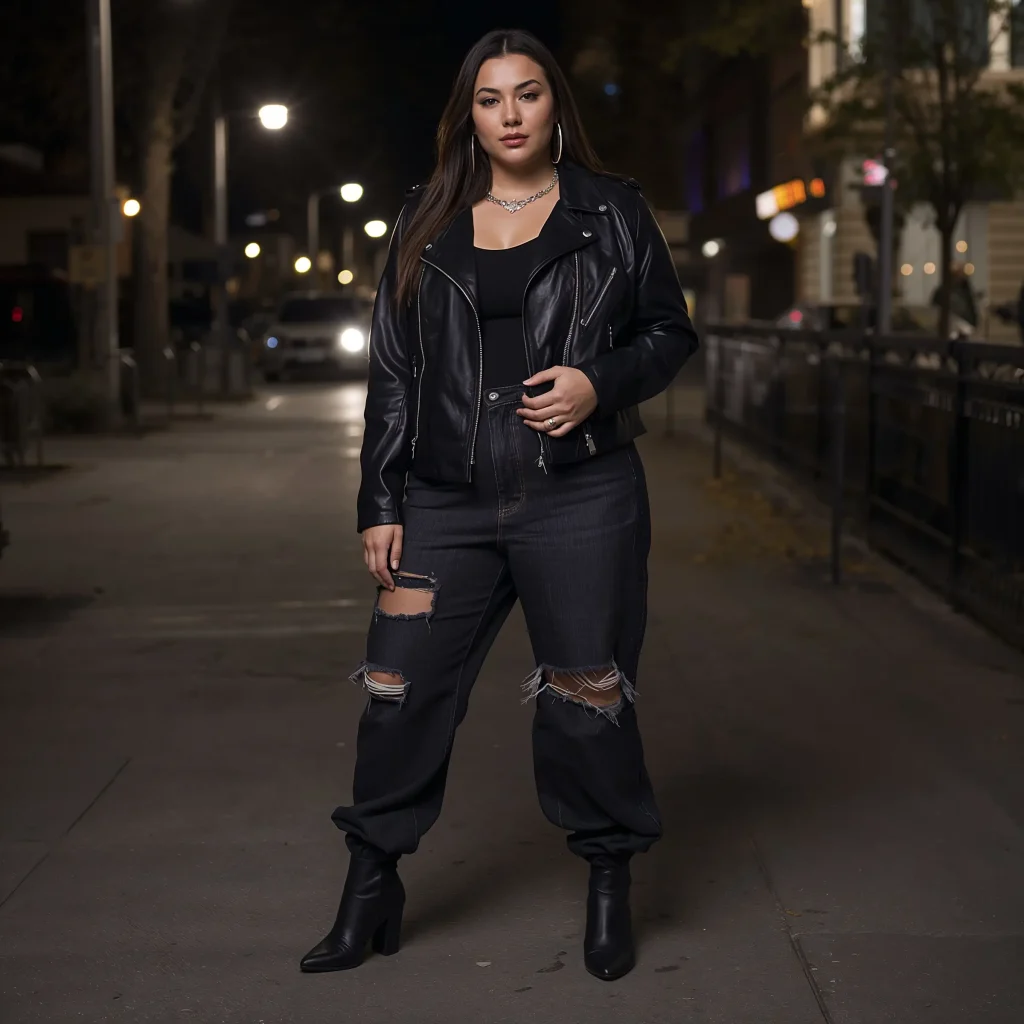 Choose a leather jacket that fits well through the shoulders – this is crucial for plus-size styling. Whether you prefer classic black, rich brown, or even colored leather, make sure the jacket hits at your hip or slightly below for the most flattering proportion.