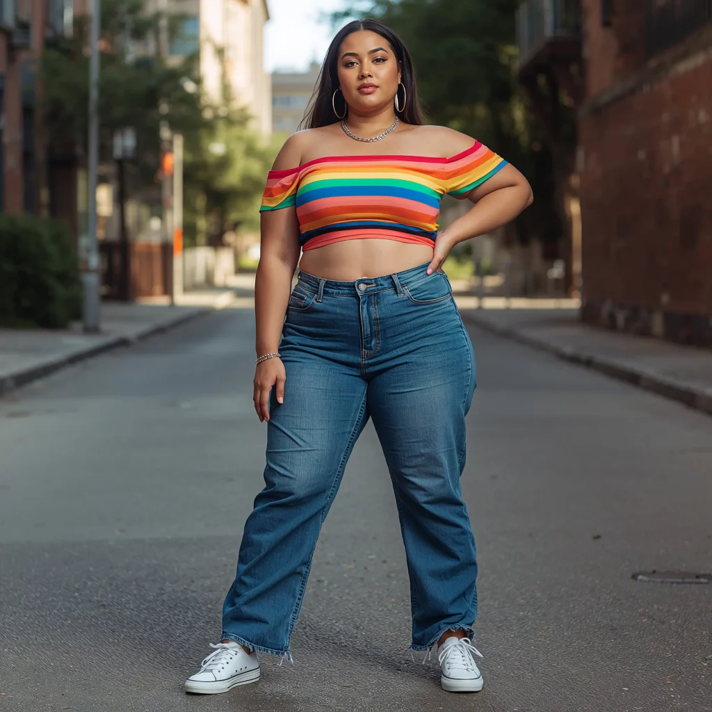 Okay, let’s address the elephant in the room – crop tops and plus-size bodies are a match made in heaven! The high-waisted baggy jeans and crop top combo creates the perfect proportions, showing just a hint of skin while keeping things comfortable.