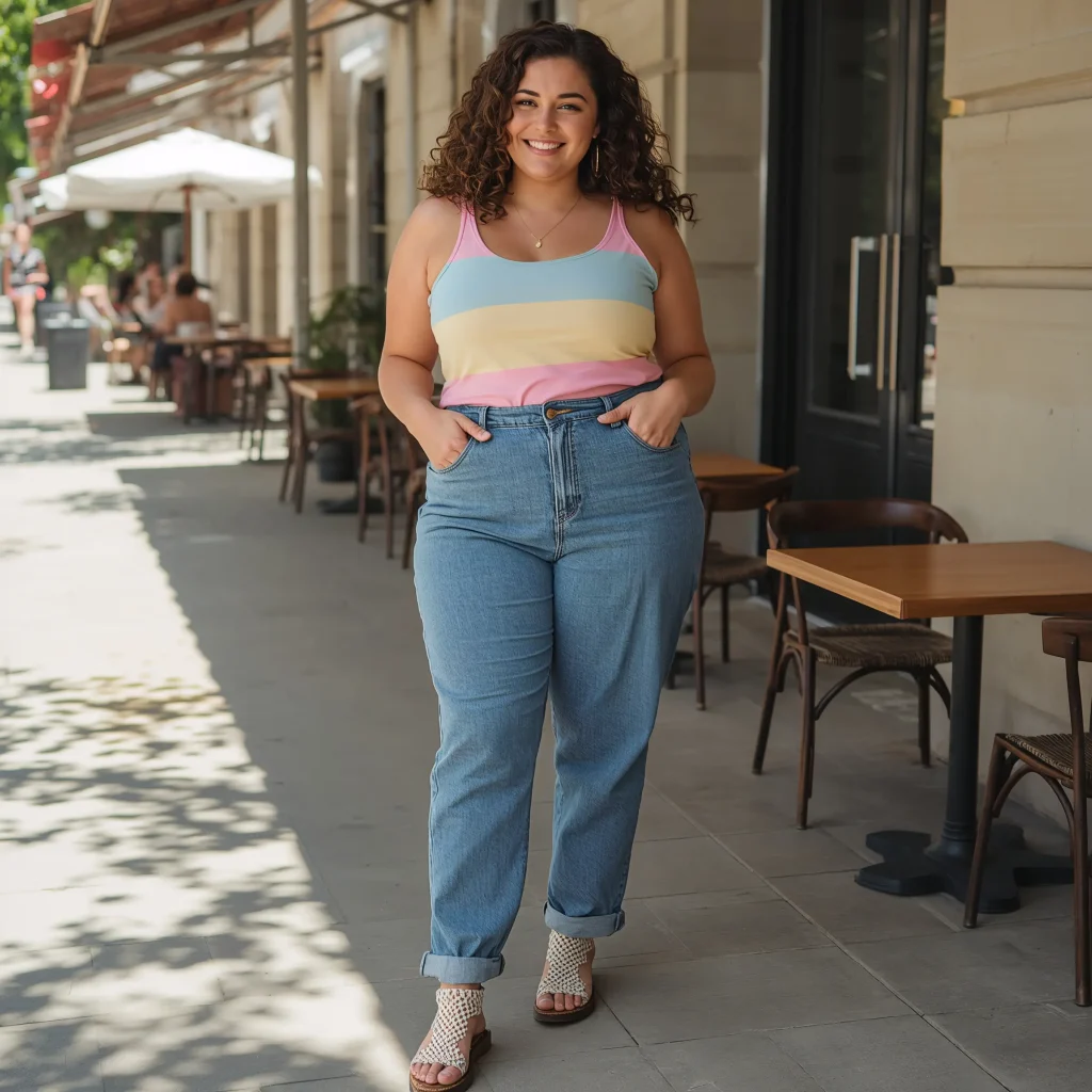 Choose a fitted ribbed tank or a slightly loose linen option depending on your comfort level. The contrast between the breezy top and substantial denim creates an interesting visual dynamic. Add some strappy sandals or canvas sneakers, and you’ve got the perfect summer outfit.
