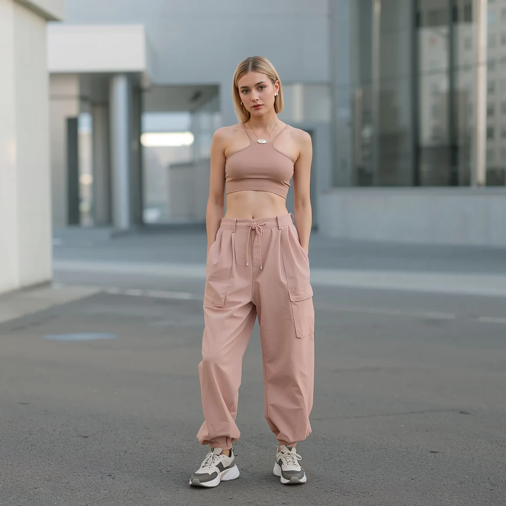 Choose baggy track pants or wide-leg sweatpants in neutral tones. Pair them with a fitted crop top – nothing too revealing, just enough to show a hint of skin and create proportion. The contrast between the fitted top and loose bottom creates visual interest without trying too hard.