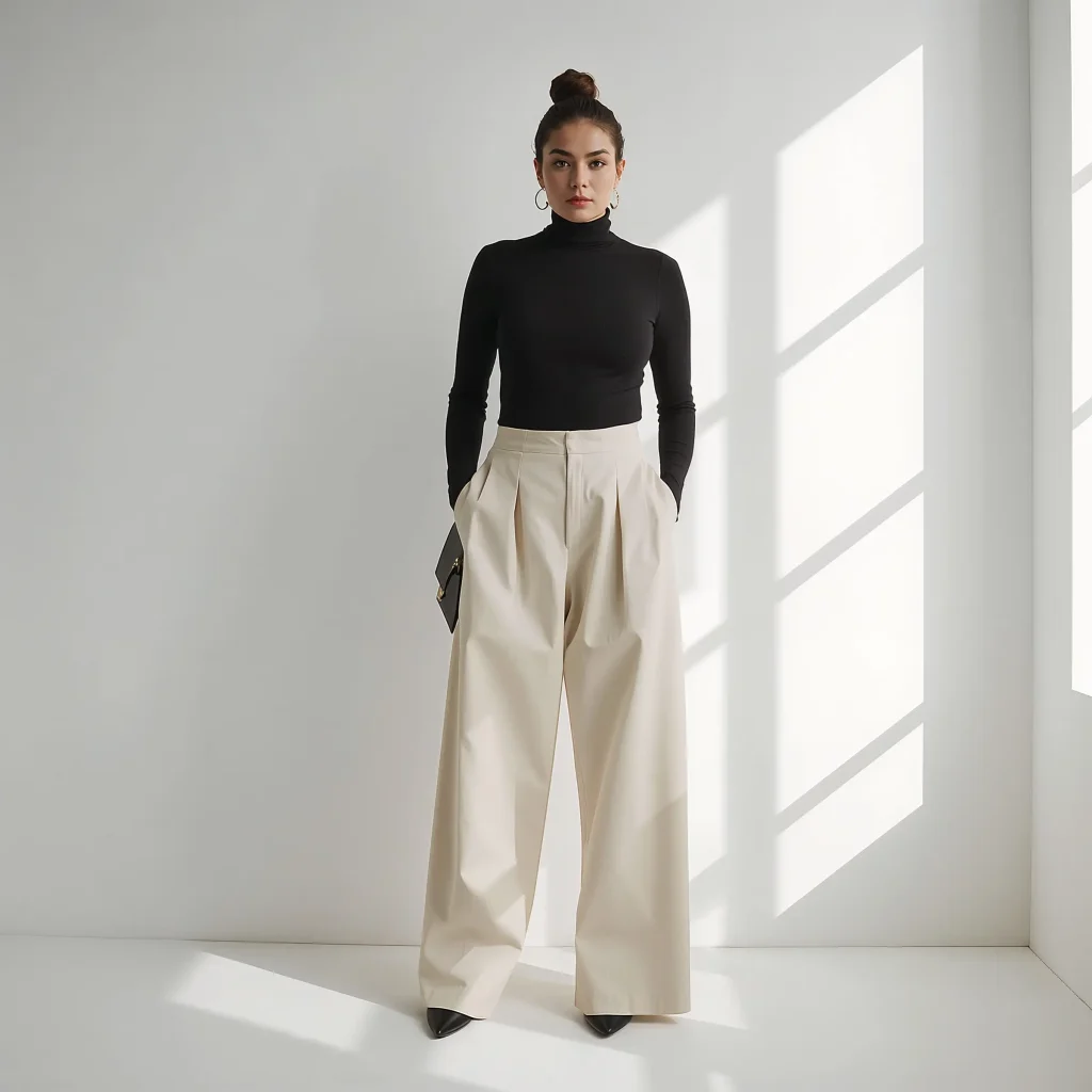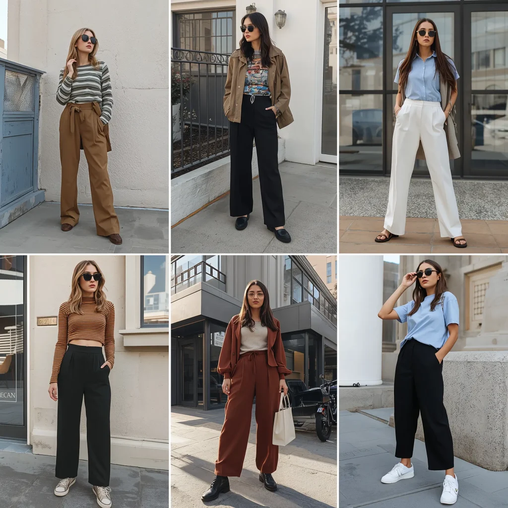 Choose high-waisted baggy pants in quality fabrics – wool blends, thick cotton, or even linen for warmer months. I personally swear by my charcoal grey pair that goes with literally everything. Pair them with a silk camisole or a crisp button-down shirt.