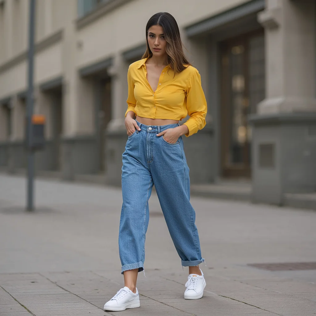 Denim baggy pants ground the bright colors beautifully, preventing you from looking like a walking highlighter. I’ve found that light wash denim works best for daytime looks, while darker washes transition seamlessly into evening hangouts.