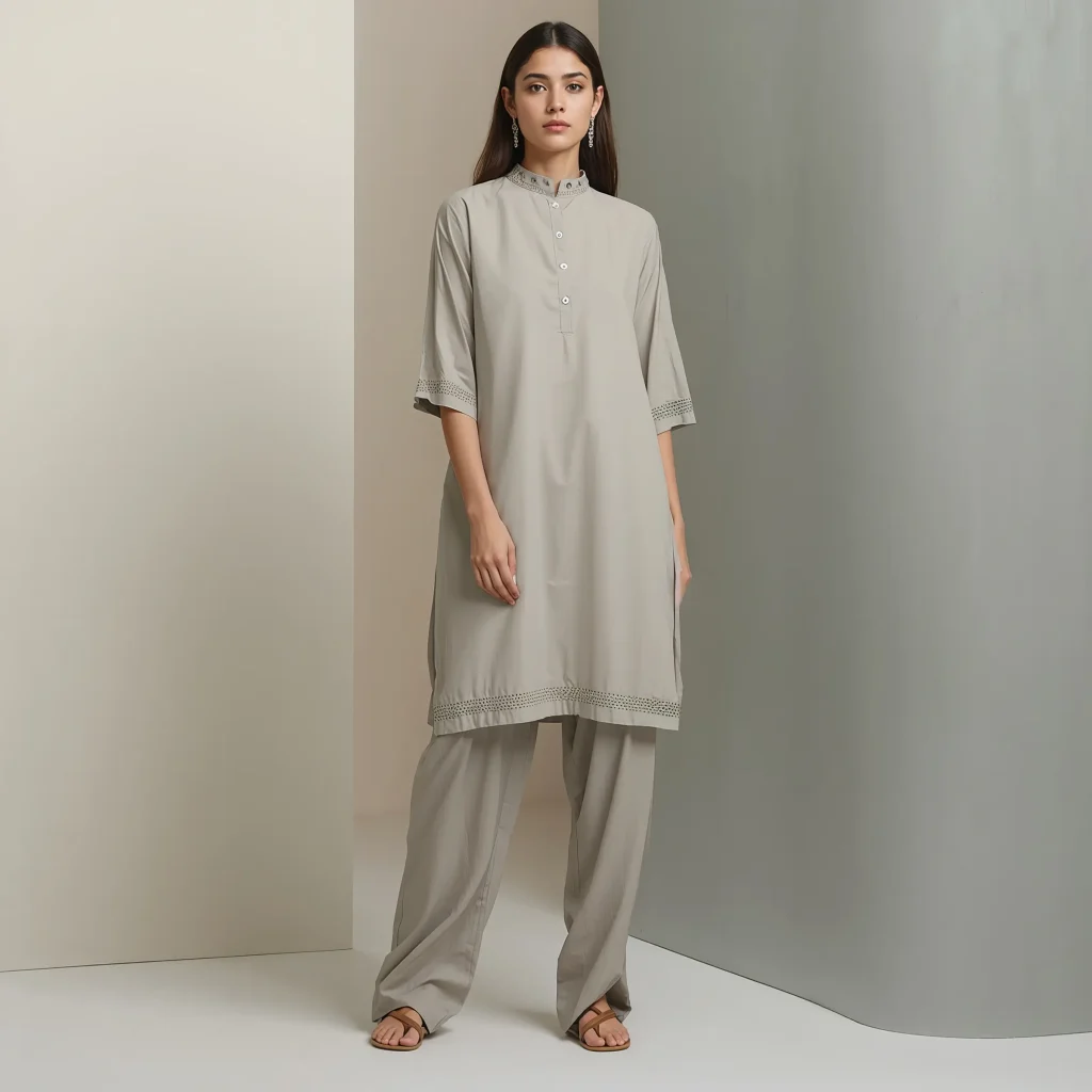The magic happens when you choose soft pastels like powder blue, mint green, or blush pink. These colors instantly make you look fresh and put-together, even when you’ve literally rolled out of bed five minutes ago. Cotton baggy pants in white or beige create the perfect canvas for your pastel kurti to shine.