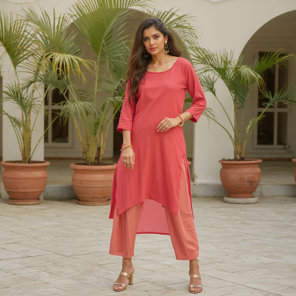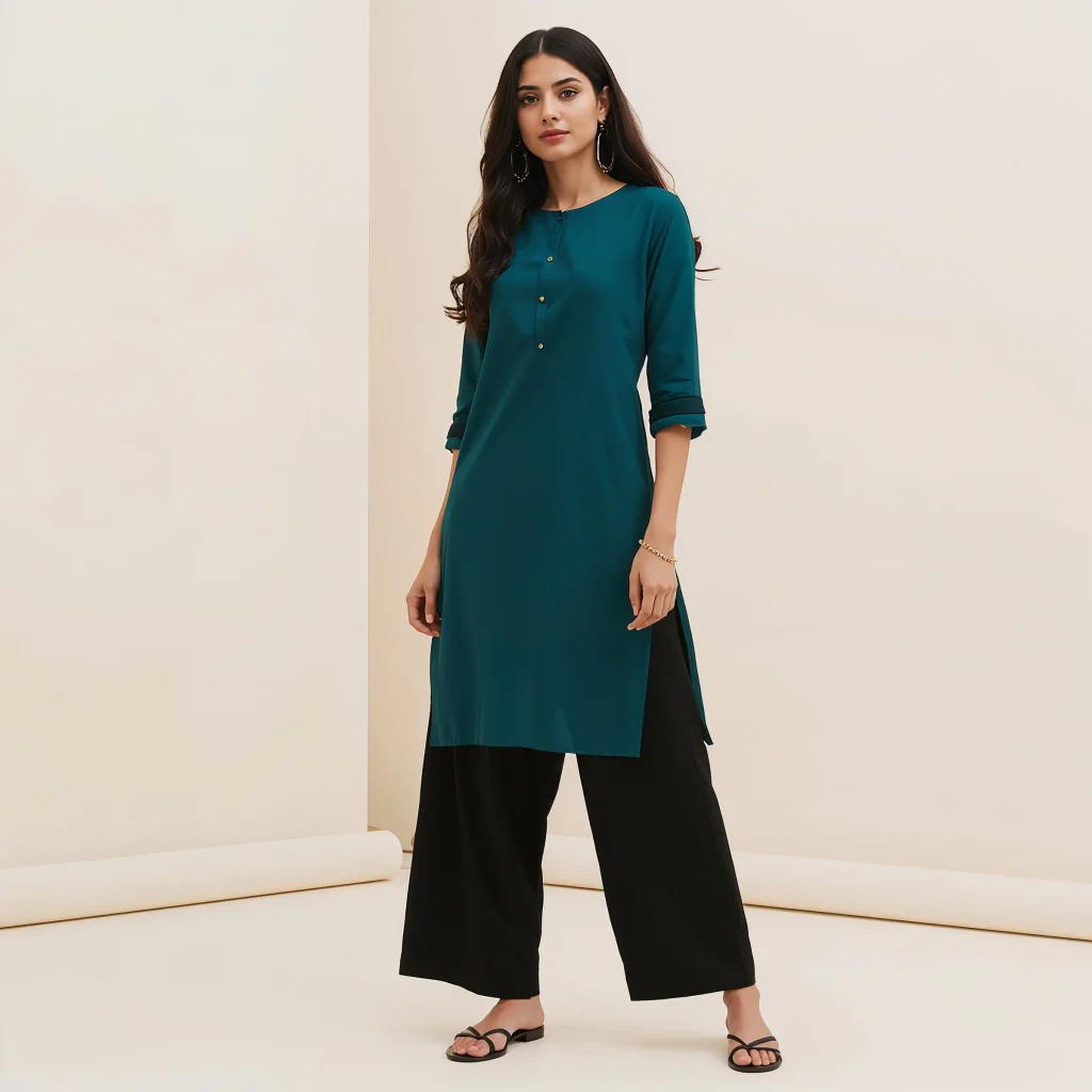 The combination works especially well with straight-cut kurtis that hit just below the hip. The slits prevent the outfit from looking boxy while the wide-leg pants maintain that relaxed, casual vibe we’re going for.
