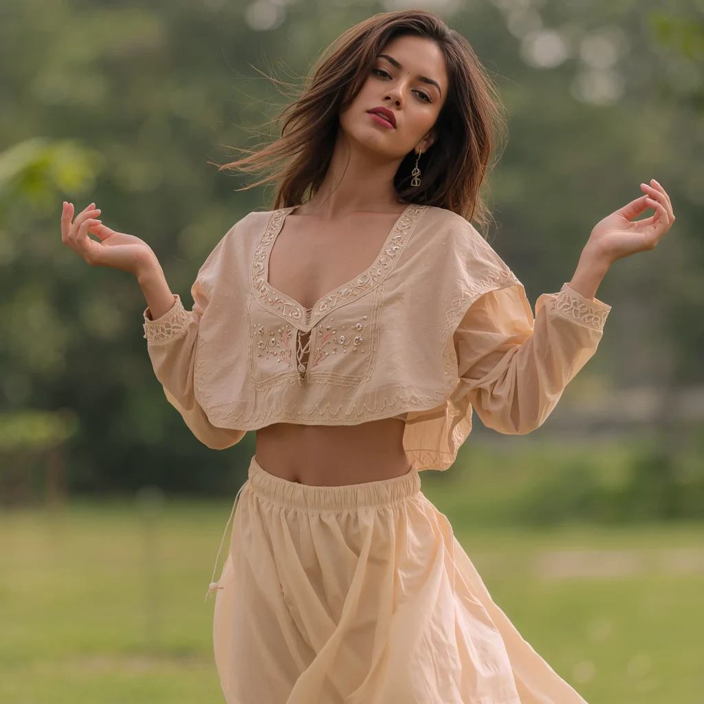 The soft linen fabric drapes beautifully, and the cropped length of the kurti prevents the outfit from overwhelming petite frames. This combination has become my go-to for brunch dates and art gallery visits (yes, I’m that person now).
