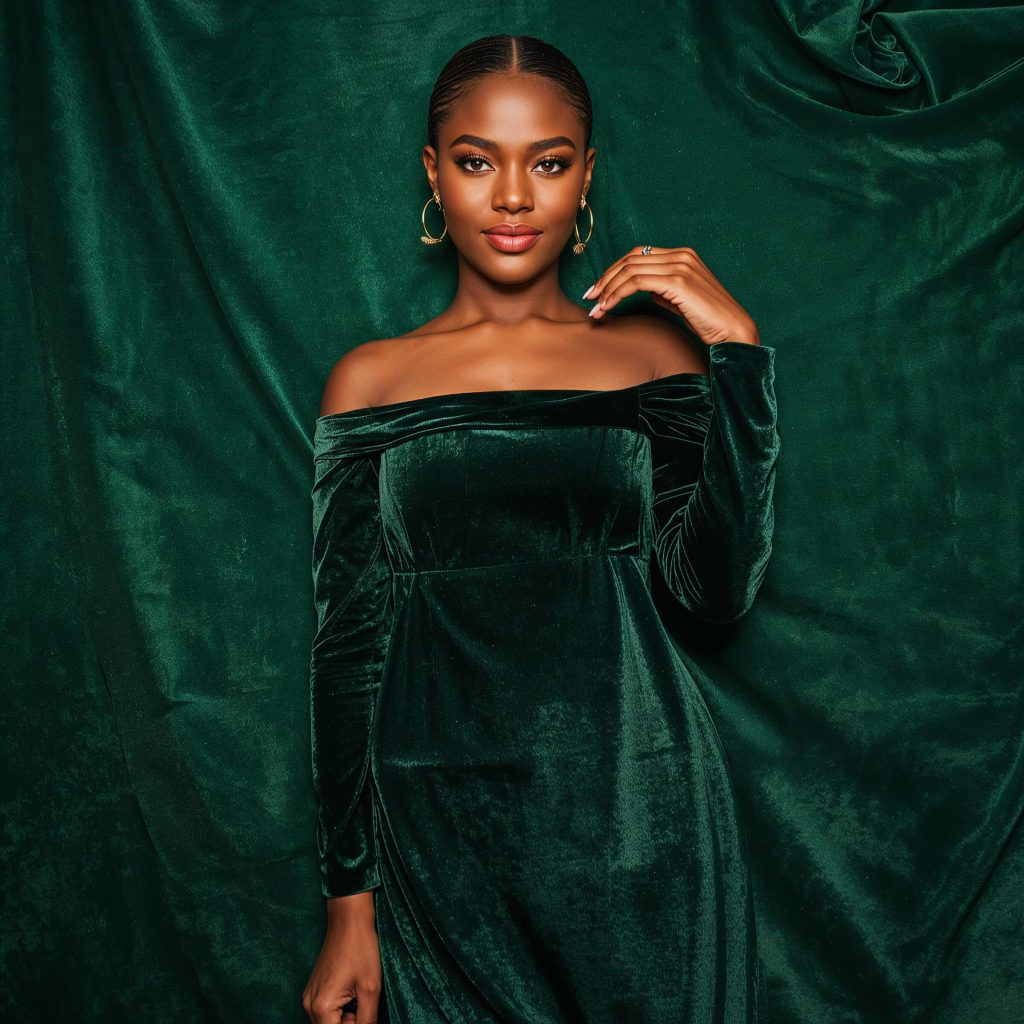Deep jewel tones like emerald, sapphire, and burgundy look absolutely stunning against darker skin tones. But don’t overlook black velvet – it’s classic for a reason. The off-shoulder detail adds just the right amount of allure without being too revealing, perfect for those upscale birthday dinners before hitting the club.