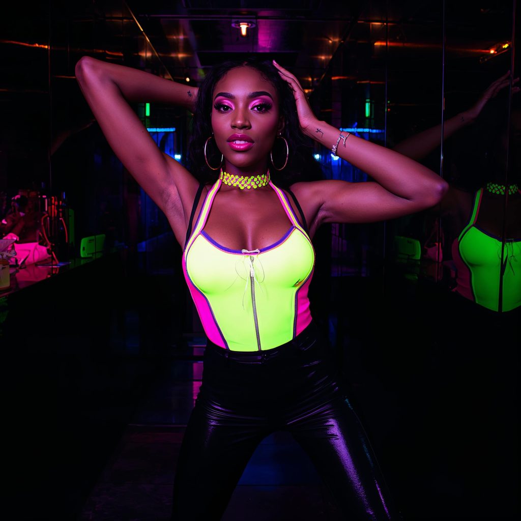 I know neon sounds intimidating, but hear me out. You don’t have to go full highlighter from head to toe. Start with a neon bodysuit paired with black leather pants, or try a neon blazer over a black mini dress. The key is balance – let the neon be the star while everything else plays supporting role.