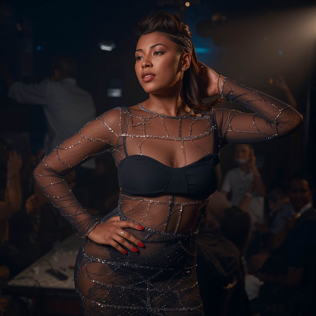 Ready to be a little daring? Mesh and sheer fabrics with strategic sparkle placement create an alluring look that’s sexy without being too revealing. The key is finding pieces with built-in coverage where it counts while letting the sheer panels do their magic.