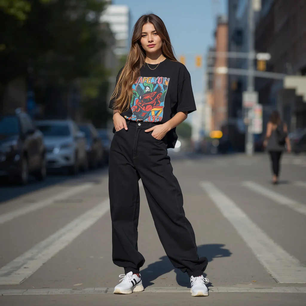 Let’s start with the classic combo that never fails. Pairing black baggy jeans with a graphic tee is like making a peanut butter sandwich – simple, satisfying, and always hits the spot. I usually reach for vintage band tees or those ironic slogan shirts that make people do a double-take.