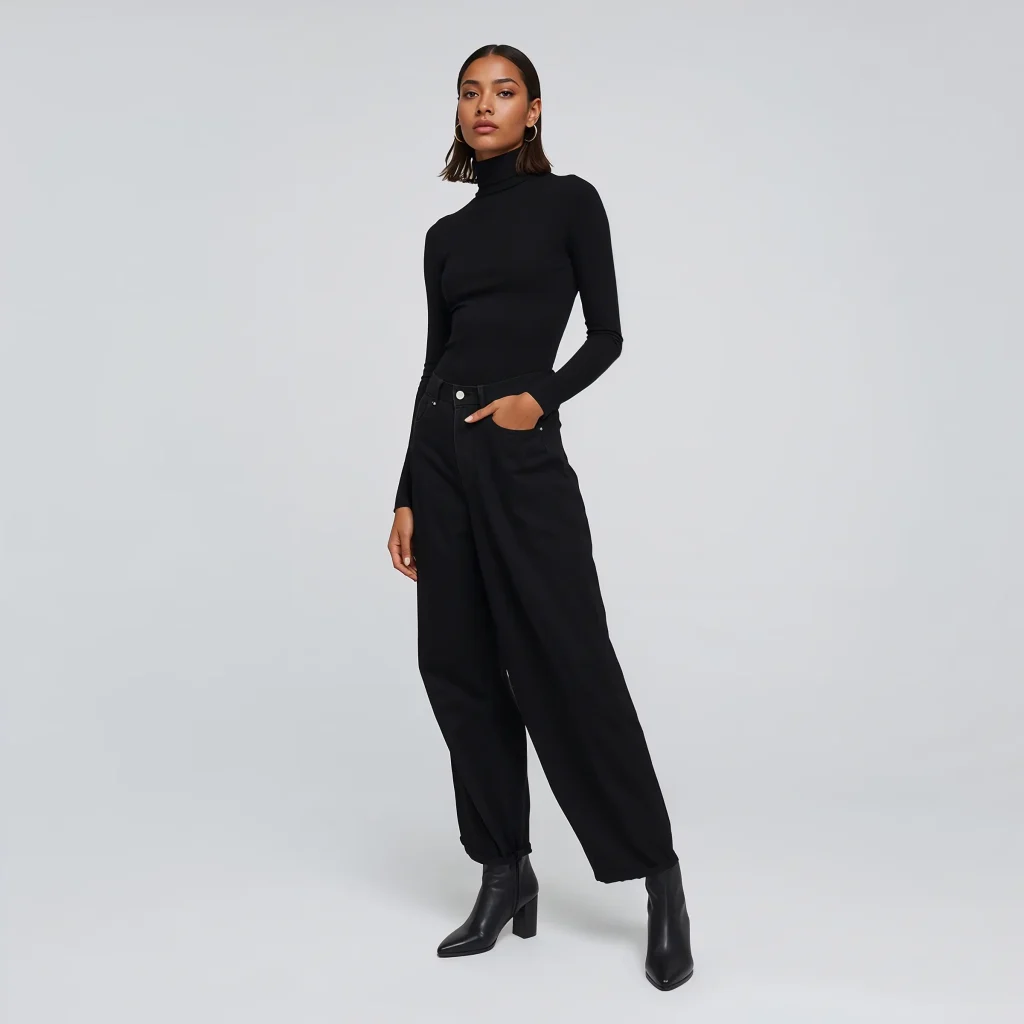 Start with your black baggy jeans as the foundation. Add a fitted black turtleneck or a sleek black tank top depending on the weather. The contrast between the fitted top and loose bottoms creates that perfect balanced silhouette that fashion bloggers are always talking about.