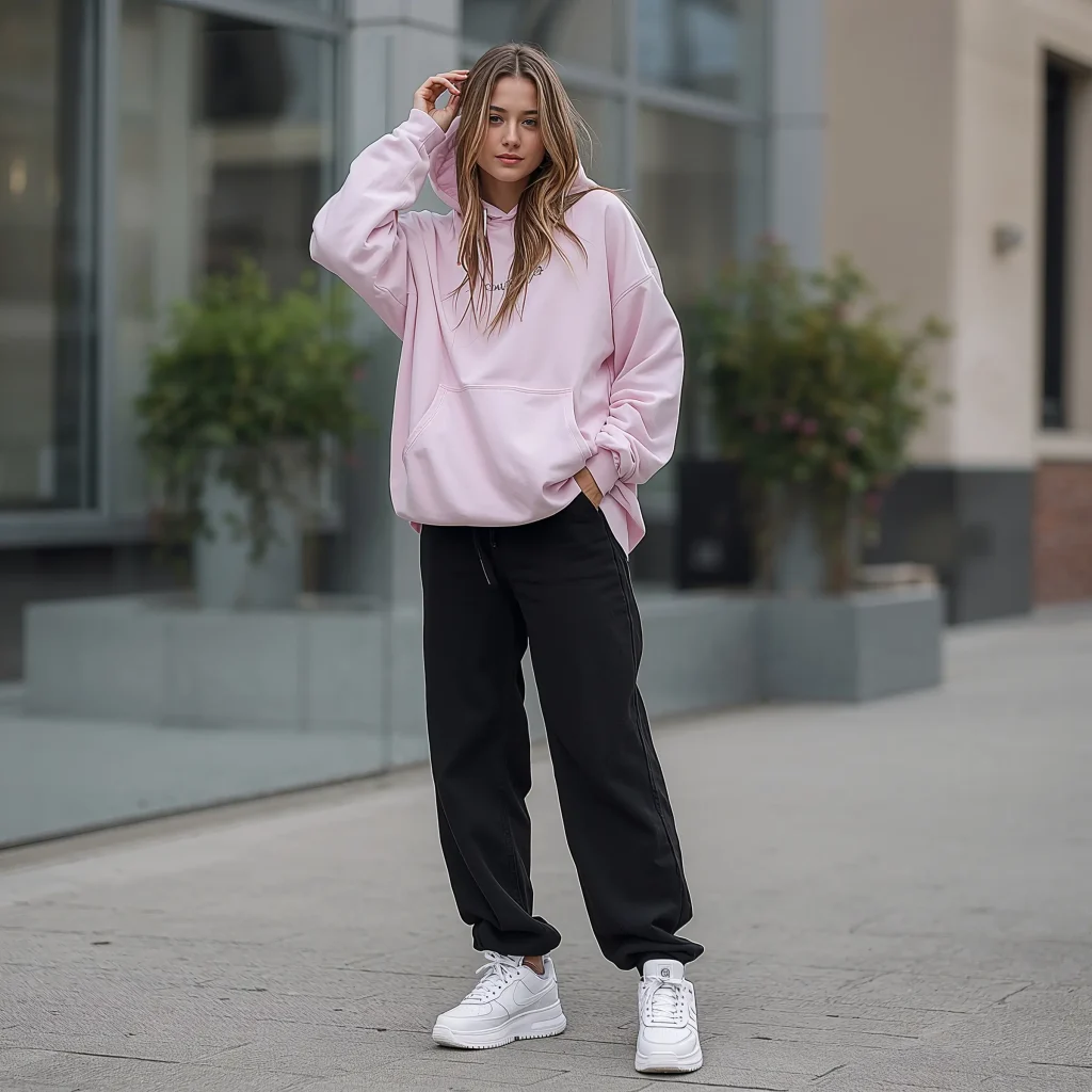 This is my go-to “I woke up like this” outfit that somehow always gets compliments. Oversized hoodies with black baggy jeans create that perfect cozy-but-cool aesthetic that screams effortless style. And honestly, who doesn’t love feeling like they’re wearing a blanket in public?