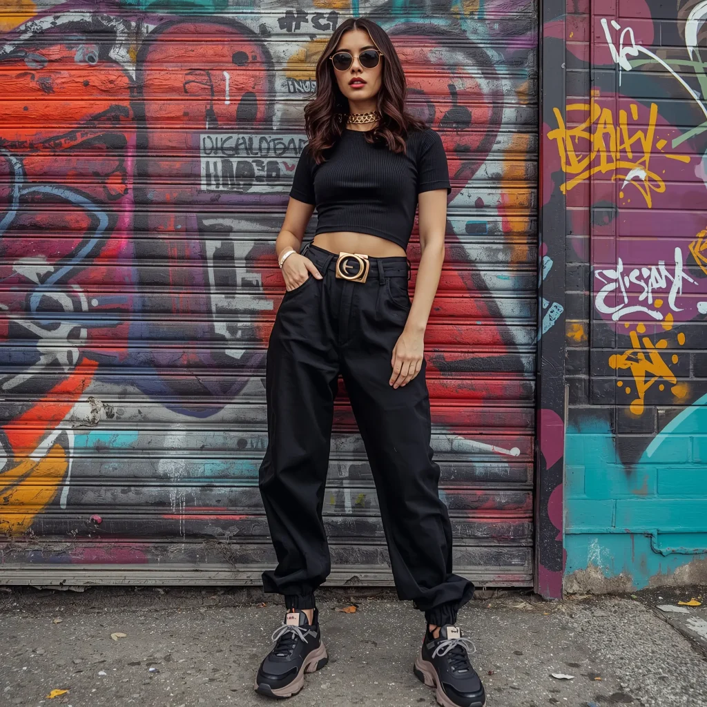 Ready to show some skin? The crop top and statement belt combination with black baggy jeans is pure street fashion gold. This look plays with proportions in all the right ways, and trust me, you’ll feel like a total badass wearing it.