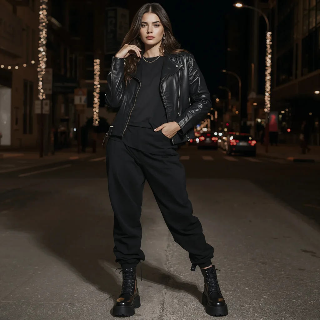 Nothing says street fashion quite like the leather jacket and chunky boots pairing. This combo with black baggy jeans creates an edge that’s both timeless and completely current. It’s the outfit equivalent of a mic drop.
