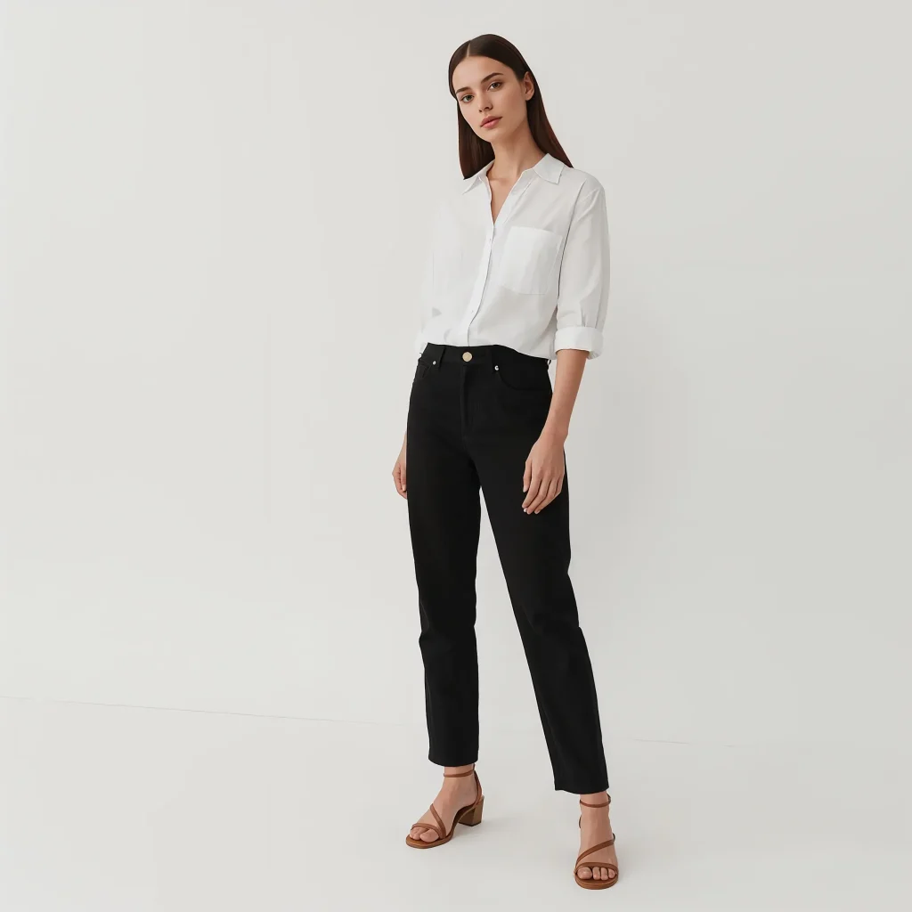 Choose a white button-down or a simple white tee – quality matters here since there’s nowhere to hide. The shirt should be slightly oversized but not swimming on you. Tuck it in loosely for that effortlessly chic vibe that French girls have trademarked.