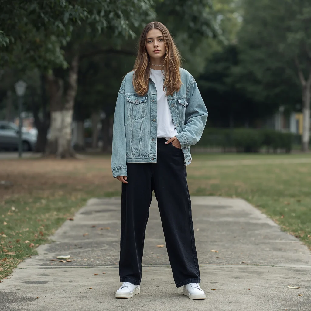 Double denim? In this economy? Actually, yes. Layering a denim jacket over black baggy jeans creates textural interest that’s surprisingly sophisticated. The key is choosing different denim shades – light blue jacket with black jeans is chef’s kiss.