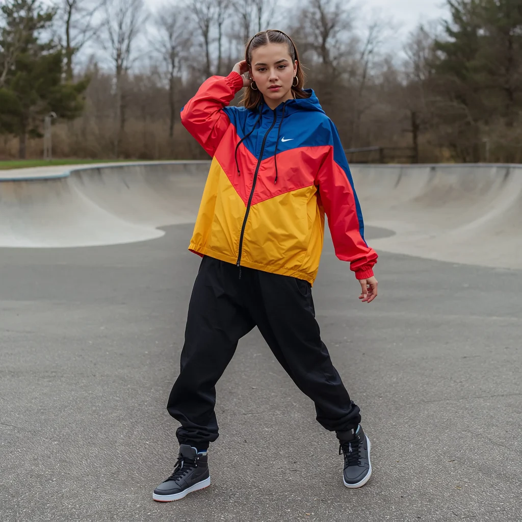 High-top sneakers are essential here – Converse, Vans, or retro Jordans all work perfectly. The high tops create a visual bridge between the baggy jeans and the windbreaker, tying everything together.