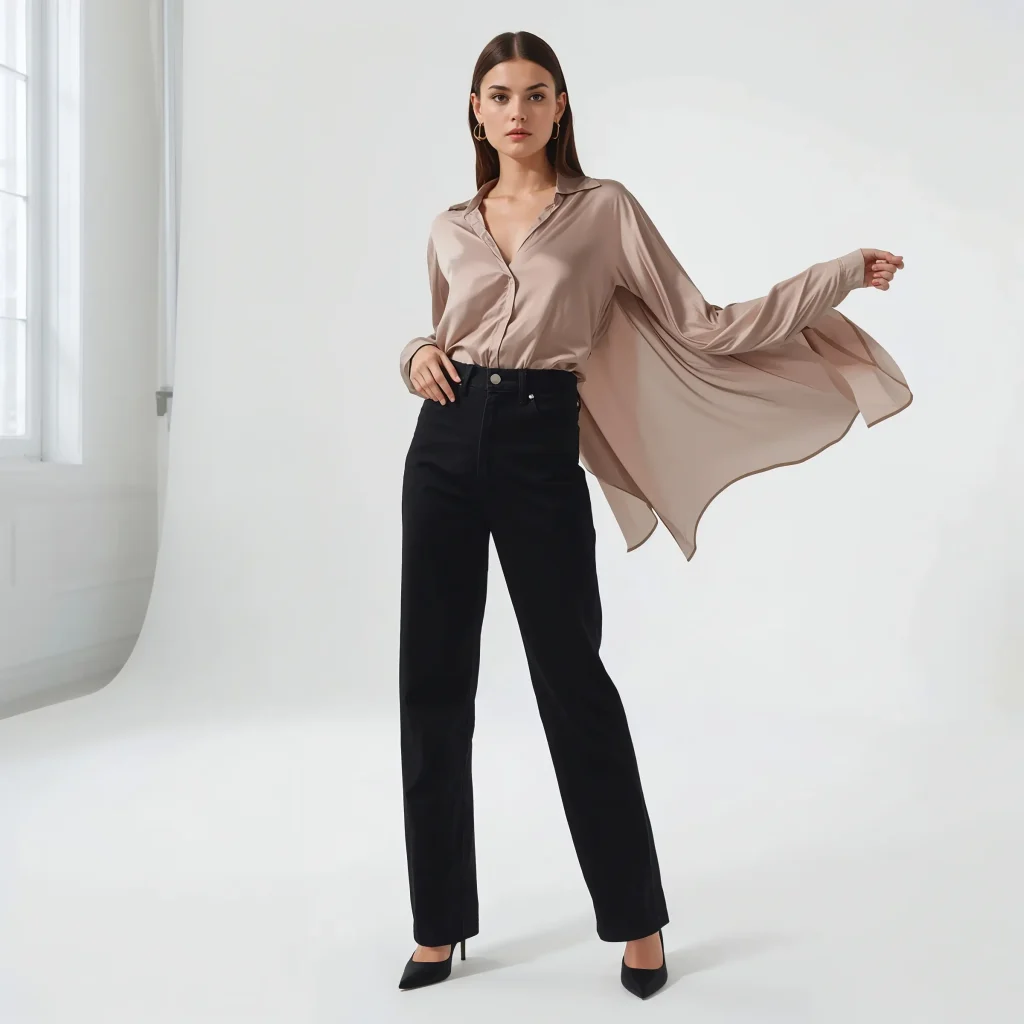 The silk blouse should drape beautifully – think jewel tones or classic ivory. Tuck it in completely and add a sleek belt to define your waist. The contrast between the luxe fabric and casual denim creates visual interest that’s impossibly chic.