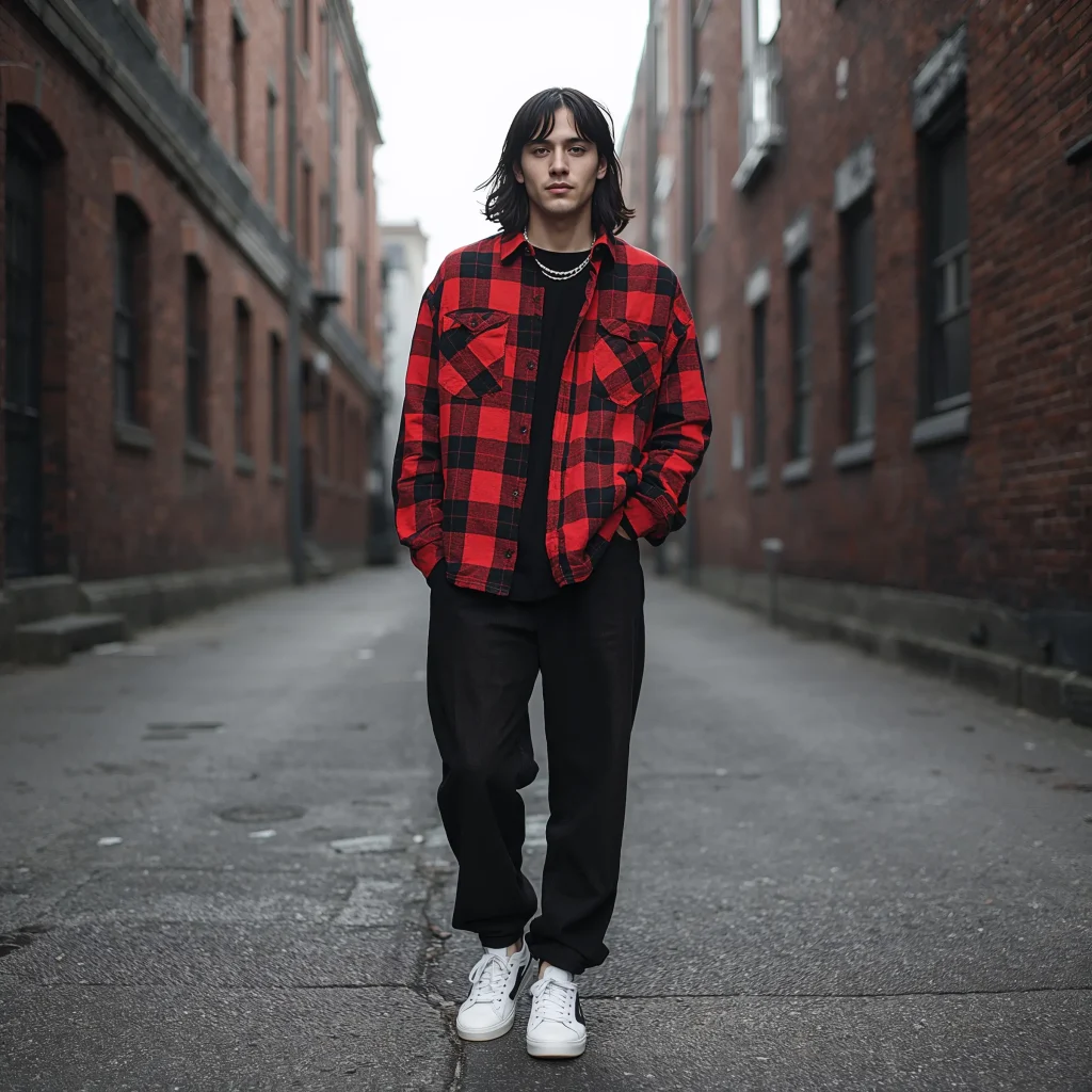 The oversized flannel shirt with black baggy jeans is basically the uniform of cool kids everywhere. This grunge-meets-streetwear look never really went out of style, and for good reason – it’s comfortable, practical, and effortlessly cool.