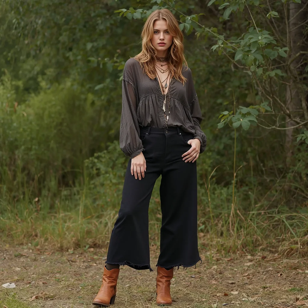Mix street style with bohemian vibes by pairing your black baggy jeans with a flowy tunic and ankle boots. This unexpected combination creates an interesting style fusion that’s both comfortable and eye-catching.