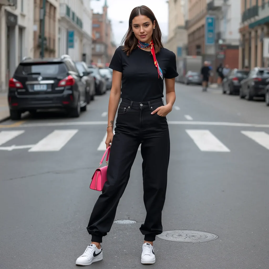 Start with your black baggy jeans and a simple white or black top. Then go crazy with accessories – think neon bags, bright sneakers, or colorful scarves. My personal favorite is a shocking pink mini bag that makes even the most basic outfit look intentional.