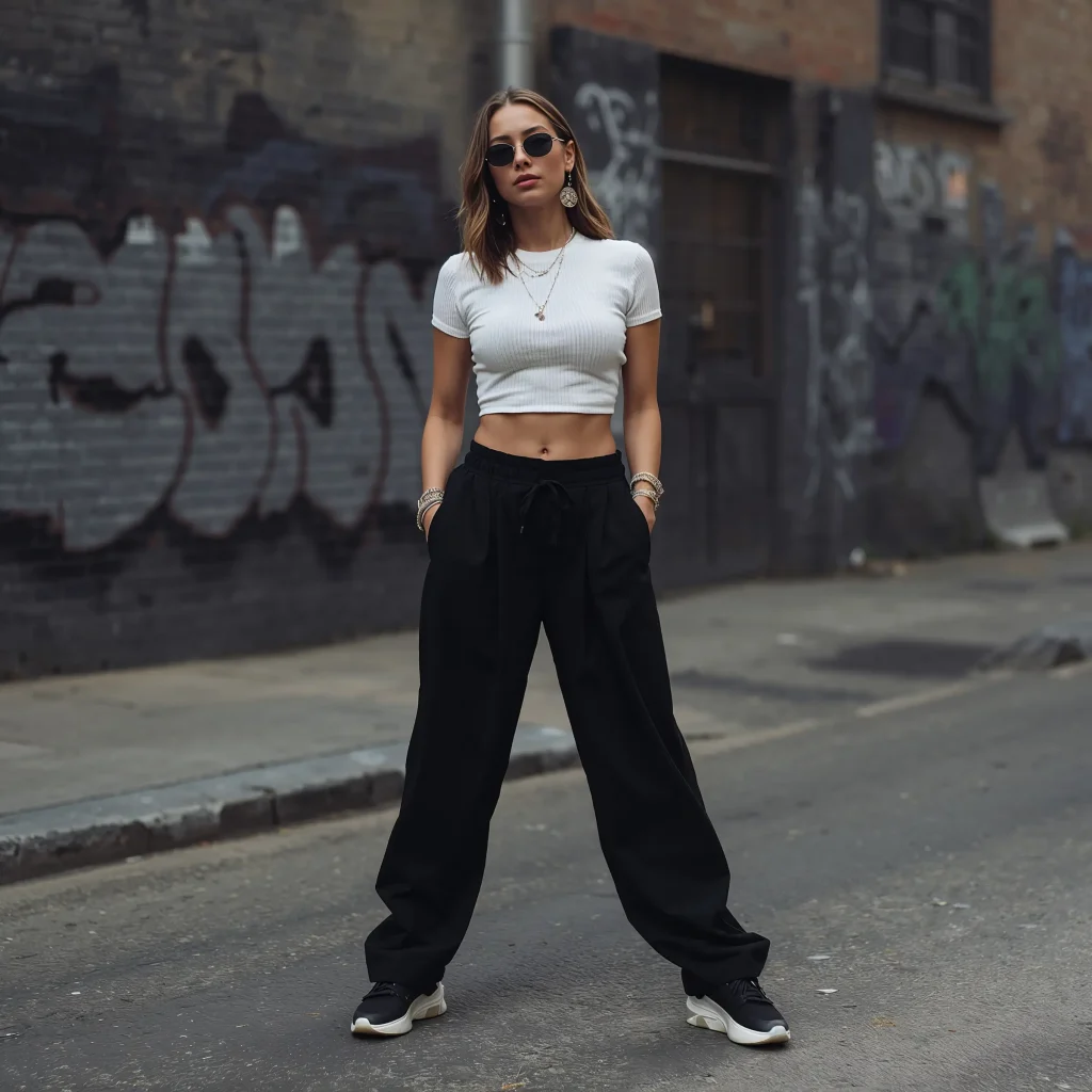 The key here? Balance is everything. Since your pants are giving major volume on the bottom, you want something snug up top. Grab a ribbed crop top – white works like a charm for that classic contrast, but don’t sleep on neon colors if you’re feeling bold.