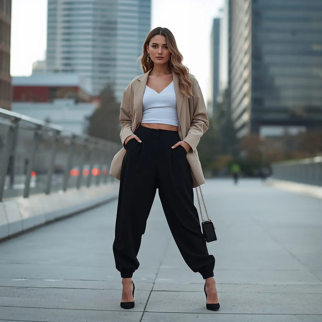 Choose a blazer that hits mid-thigh for the most flattering proportion. Structured shoulders are your friend here – they create that powerful silhouette while the baggy pants keep things modern and relaxed. Roll up those sleeves for an extra touch of “I mean business but I’m also approachable.”