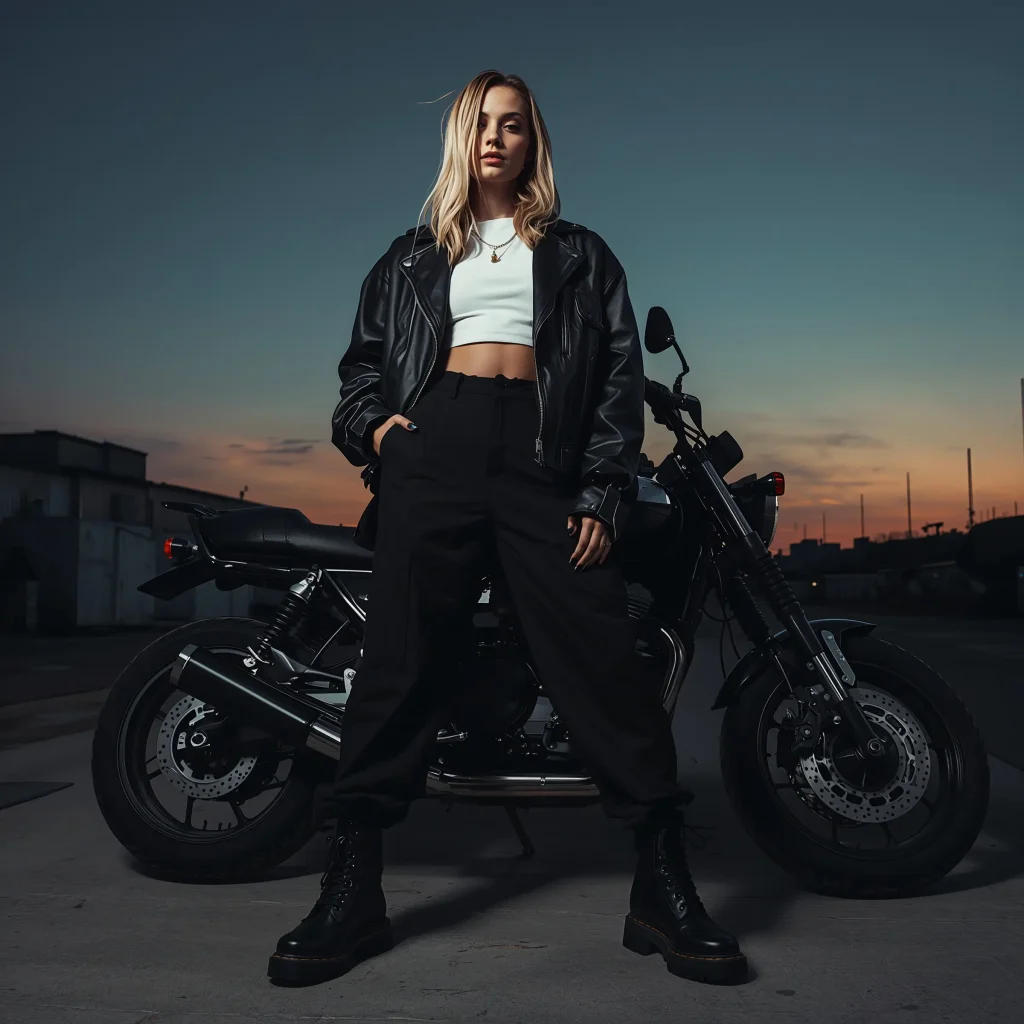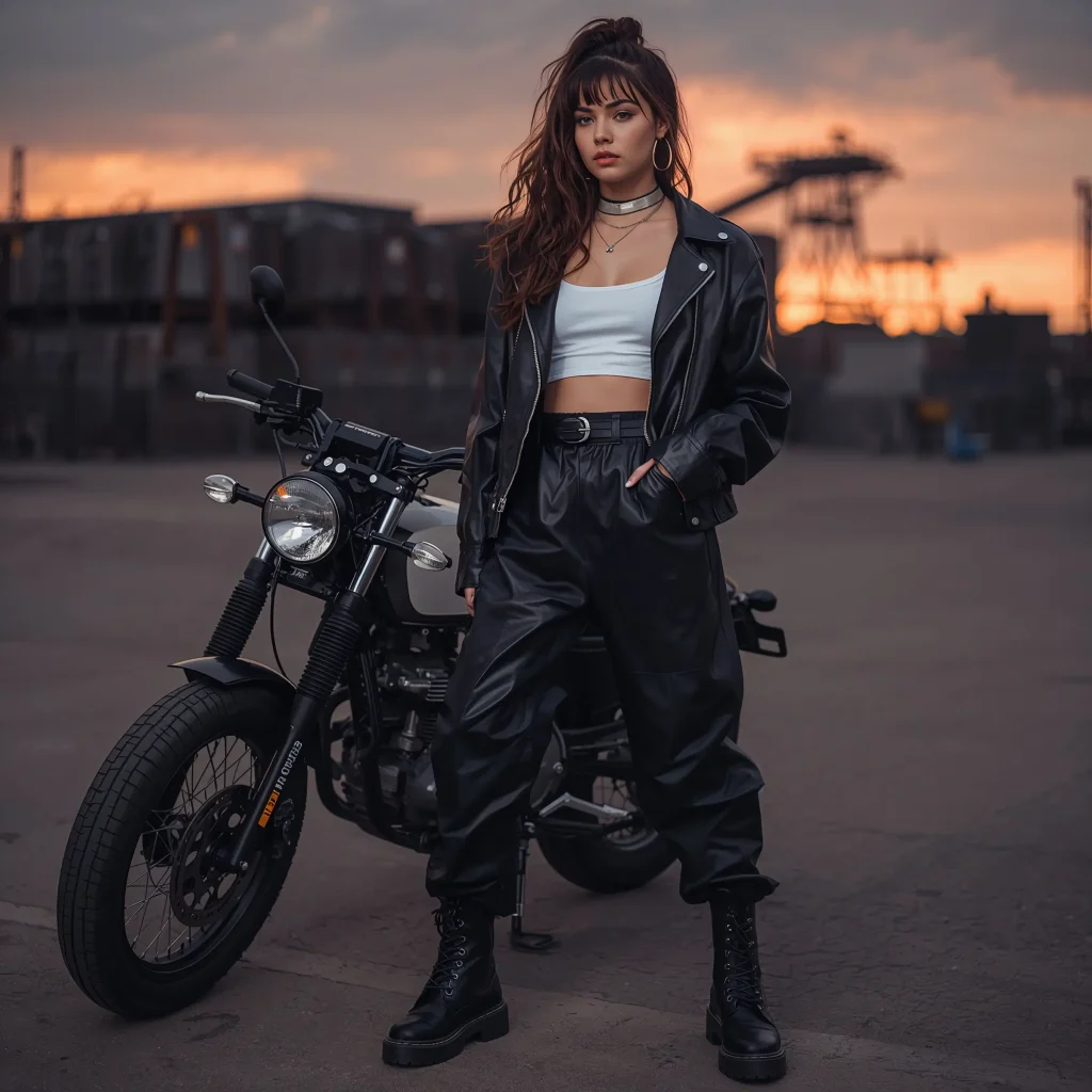 Underneath, keep it simple with a band tee or plain white tank. The leather jacket is already making a statement – you don’t need to compete with it. Finish with combat boots or chunky sneakers, and boom, you’re ready for whatever the night throws at you.