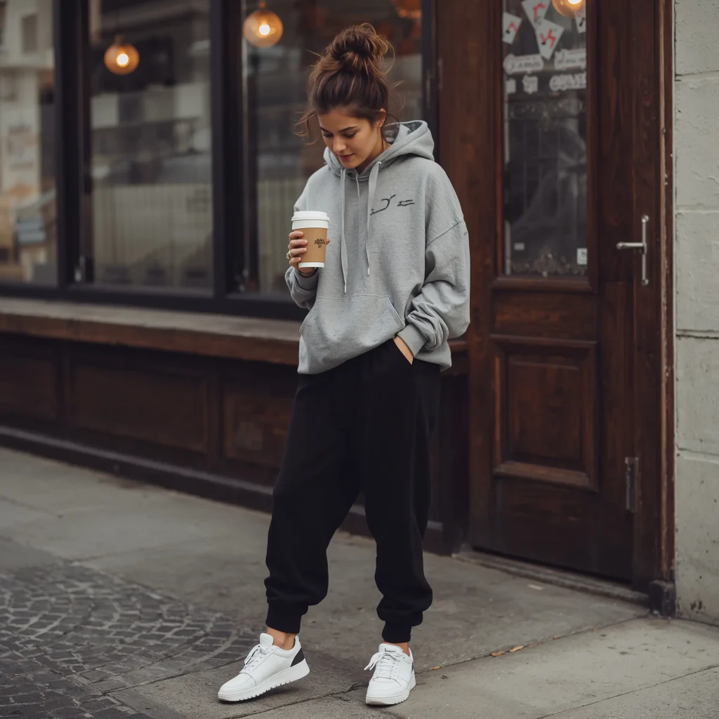 Pick an oversized hoodie (because if we’re going baggy, we might as well commit) in a contrasting color to your black pants. Gray, cream, or even a bold color works beautifully. The key is making sure your hoodie isn’t so oversized that you lose your shape entirely.