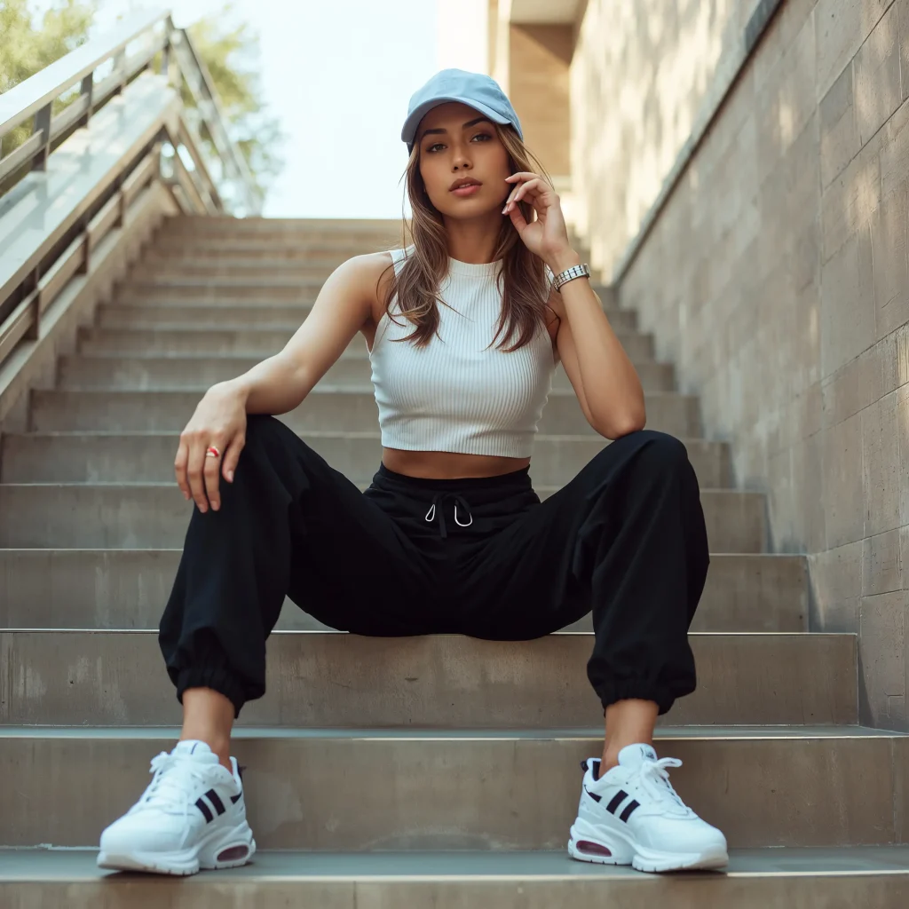 Choose a fitted sports tank or muscle tee to contrast with the loose pants. The fitted top shows you’ve got intention behind your outfit choices, not just throwing on whatever’s clean. Racing stripes or athletic brands add authenticity to the sporty aesthetic.