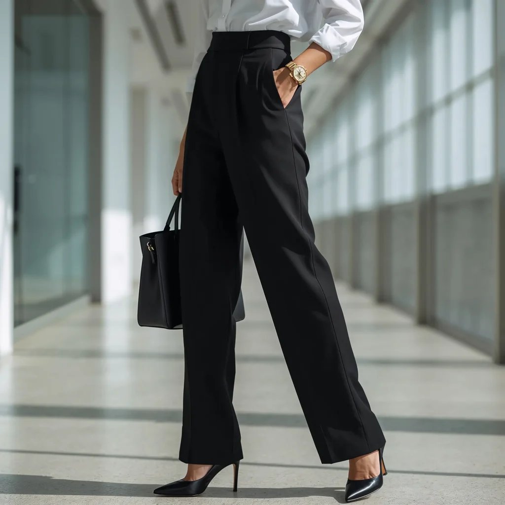Start with a crisp button-down shirt – white or light blue works perfectly. Tuck it in properly (no half-tucks here, we’re being professional) and add a sleek belt. The structure of the shirt balances the relaxed fit of the pants beautifully.