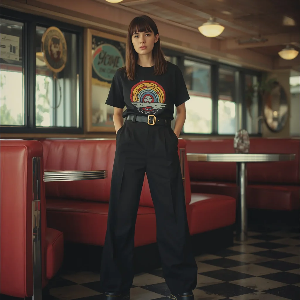Start with your black baggy pants and add a fitted black turtleneck or long-sleeve tee. The trick? Play with textures to keep things interesting. Maybe your pants are cotton while your top is a silky material, or throw in a leather belt to break things up subtly.