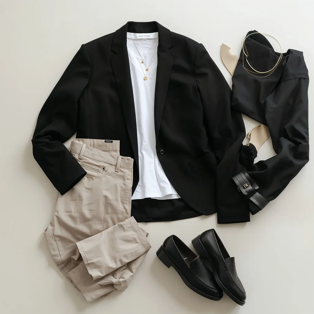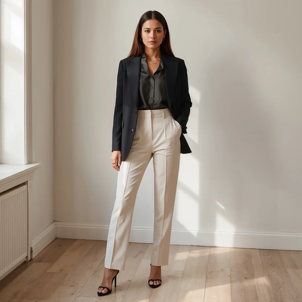 I pair my structured black blazer with high-waisted trousers in a complementary neutral like camel or cream. The contrast creates visual interest without screaming “trying too hard.” Add a silk camisole underneath instead of a traditional button-up. This swap alone modernizes the entire outfit.
